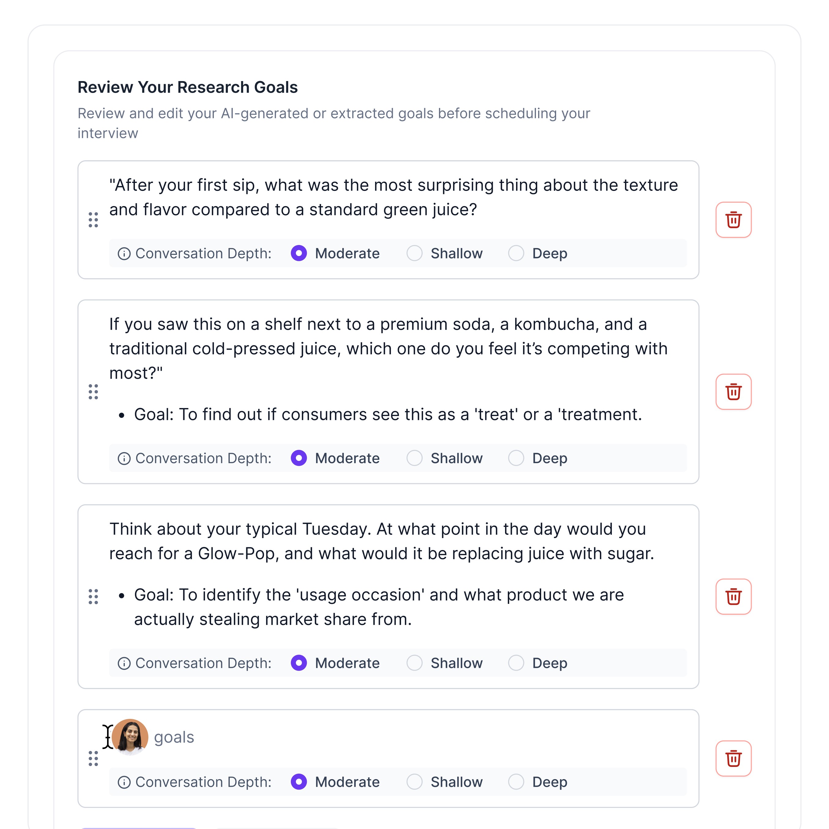 Run fully automated qualitative interviews with an AI that understands context, emotion, and intent.