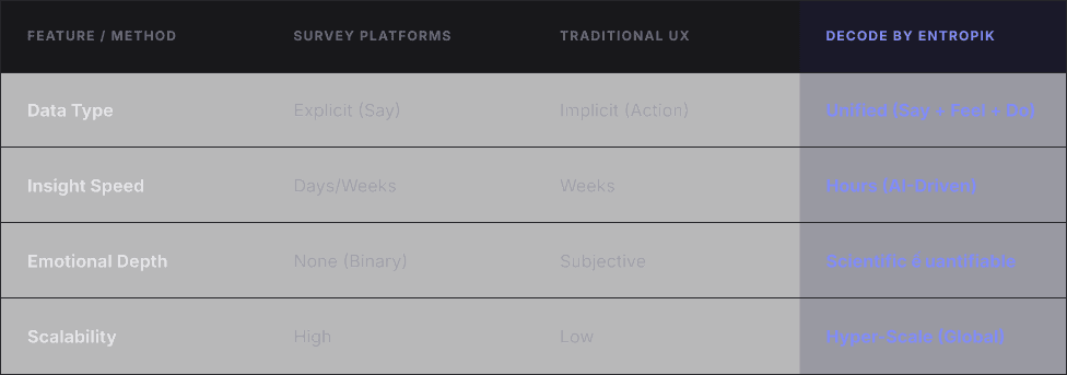How Behavioral Intelligence stacks up against traditional research methodologies.