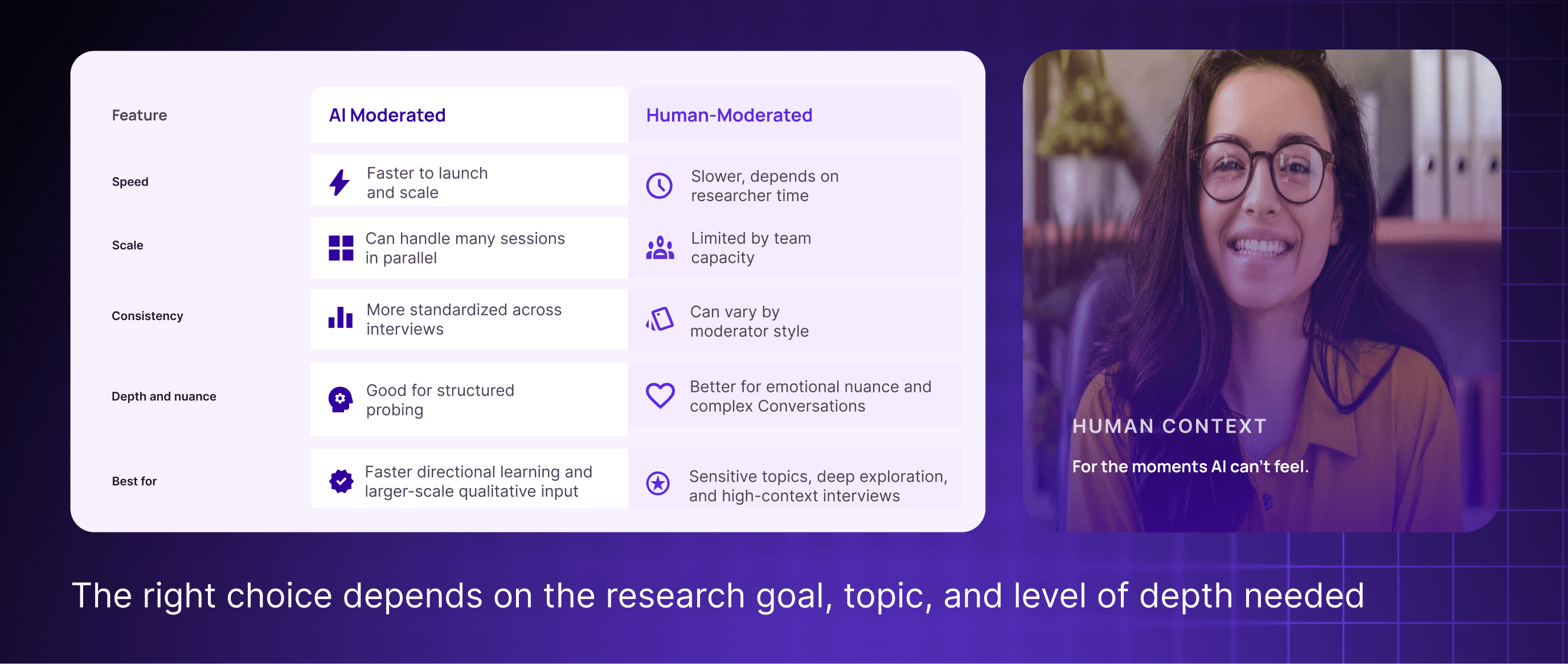 A human moderator can hear hesitation, interpret emotion, and follow unexpected but meaningful tangents. AI may miss subtle context or probe in a way that feels less natural.